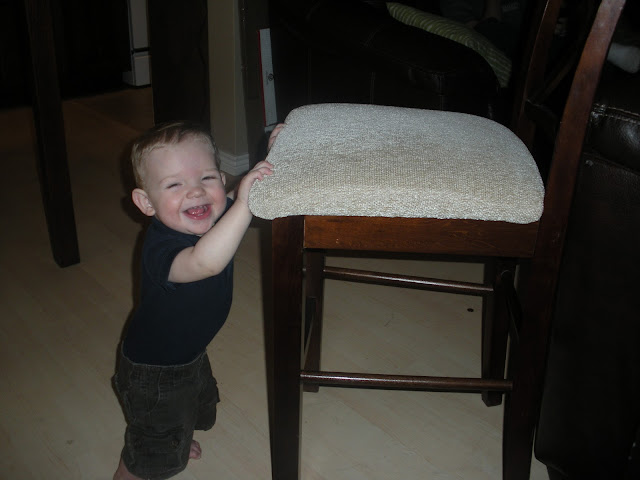 This picture was taken late March.  Hayden would help me spring clean by moving chairs so that I could sweep and mop.  It became his new favorite activity.  And, if you look closely at his mouth, you can see his new teeth!  It took 14 months, but once it started happening, he all of a sudden had 6 teeth!